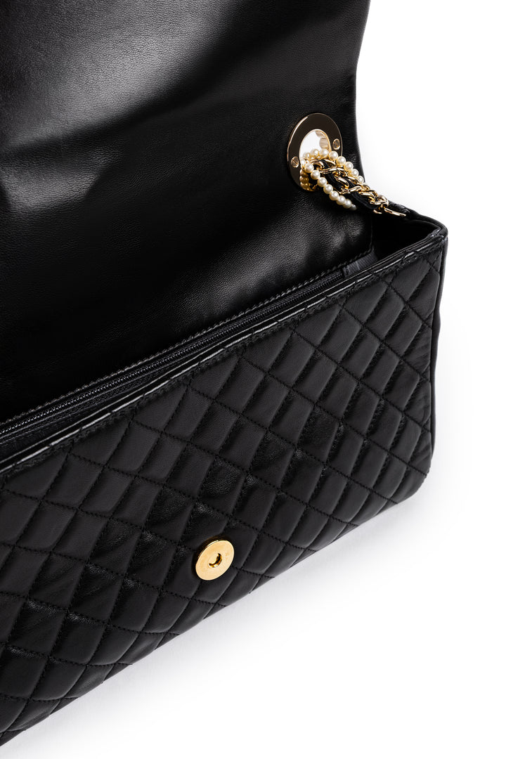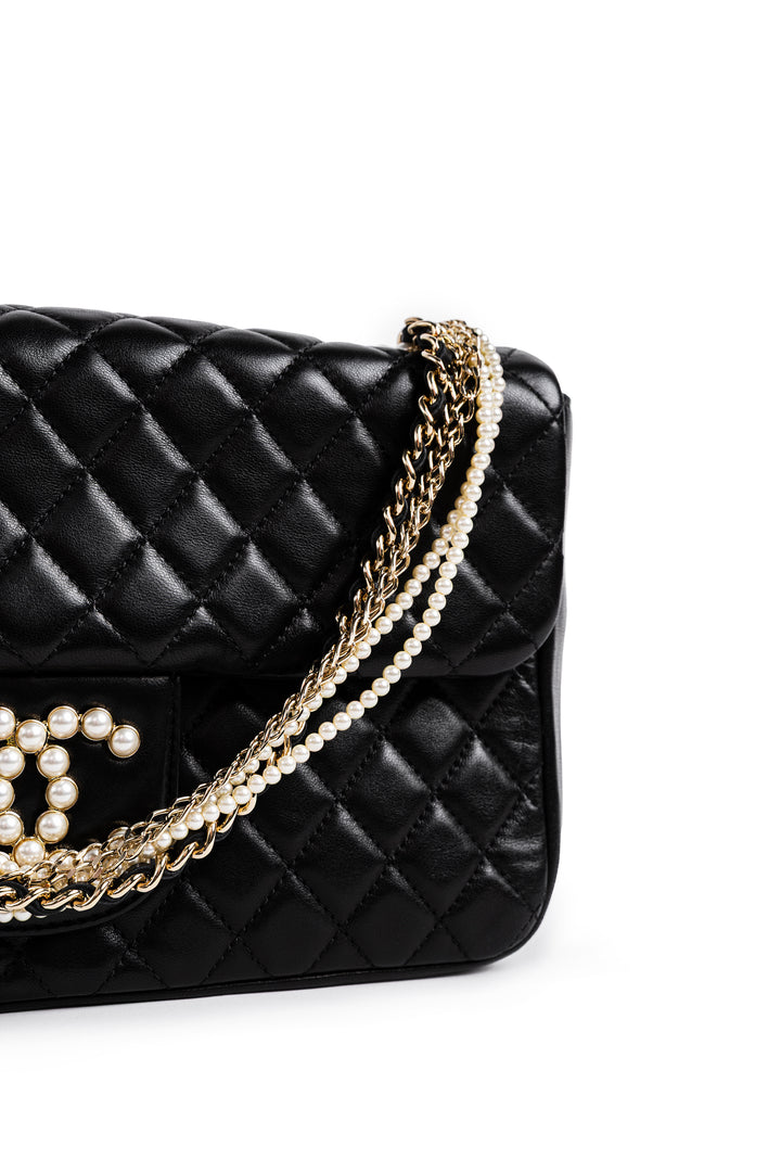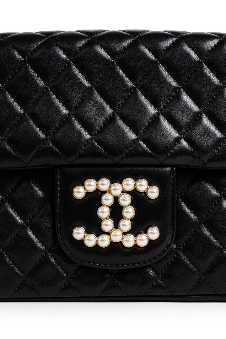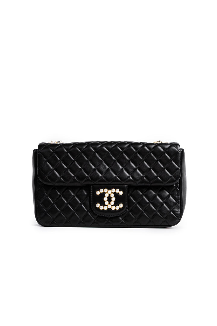 A HIGHLY COVETED AND RARE CHANEL WESTMINSTER FLAP BAG, CRAFTED IN SMOOTH LAMBSKIN LEATHER WITH A PEARL-ACCENTED CC LOGO AND GOLD-TONE HARDWARE. THIS ELEGANT DESIGN STANDS OUT WITH ITS INTERWOVEN PEARL-DETAILED CHAIN STRAP, MAKING IT A COLLECTOR’S PIECE AND A TRUE STATEMENT BAG.