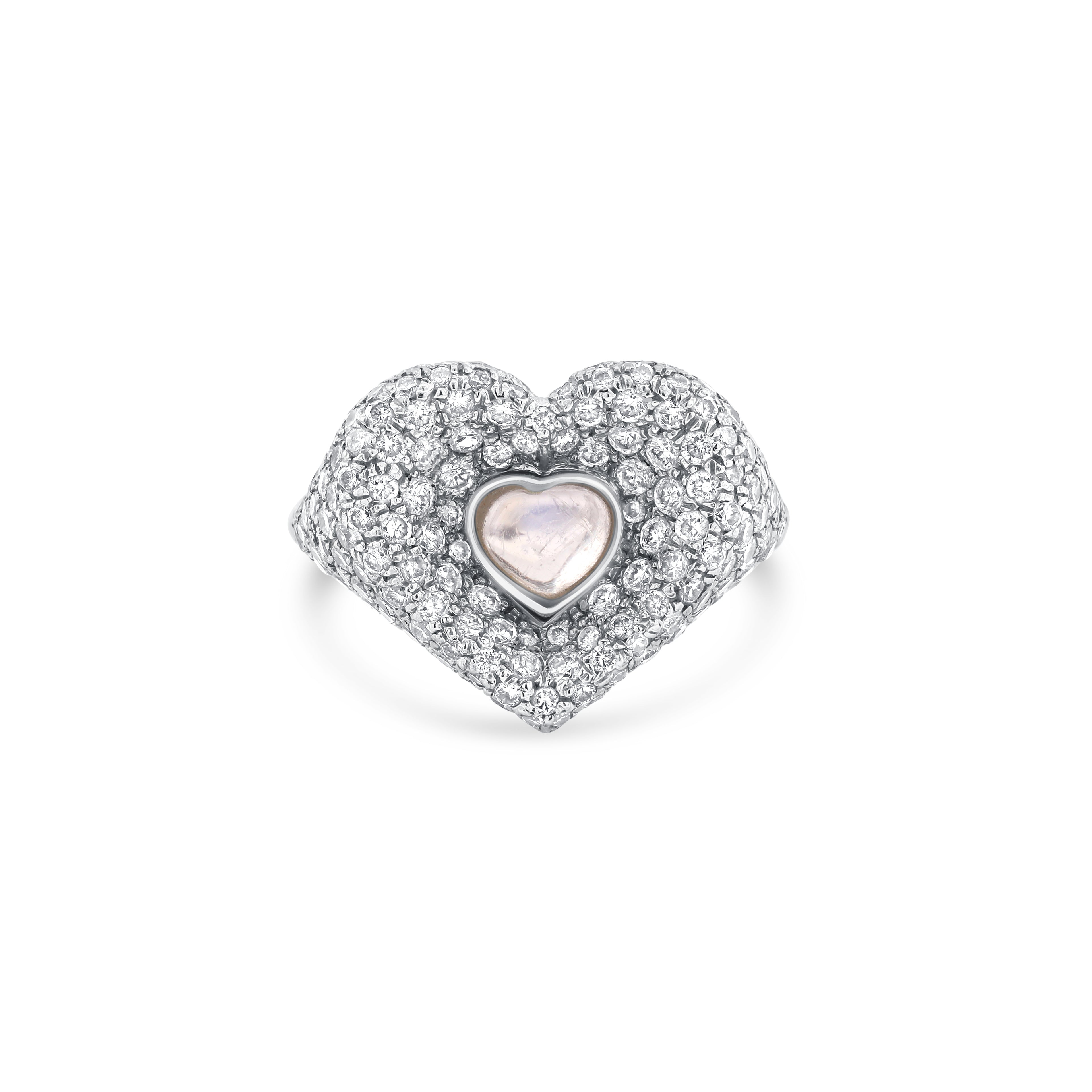 HANDCRAFTED IN 18K GOLD AND SET WITH NATURAL DIAMONDS, THIS HEART-SHAPED PINKY RING GLOWS WITH A NATURAL MOONSTONE, THE BIRTHSTONE OF JUNE, SYMBOLIZING INTUITION AND EMOTIONAL HARMONY.
