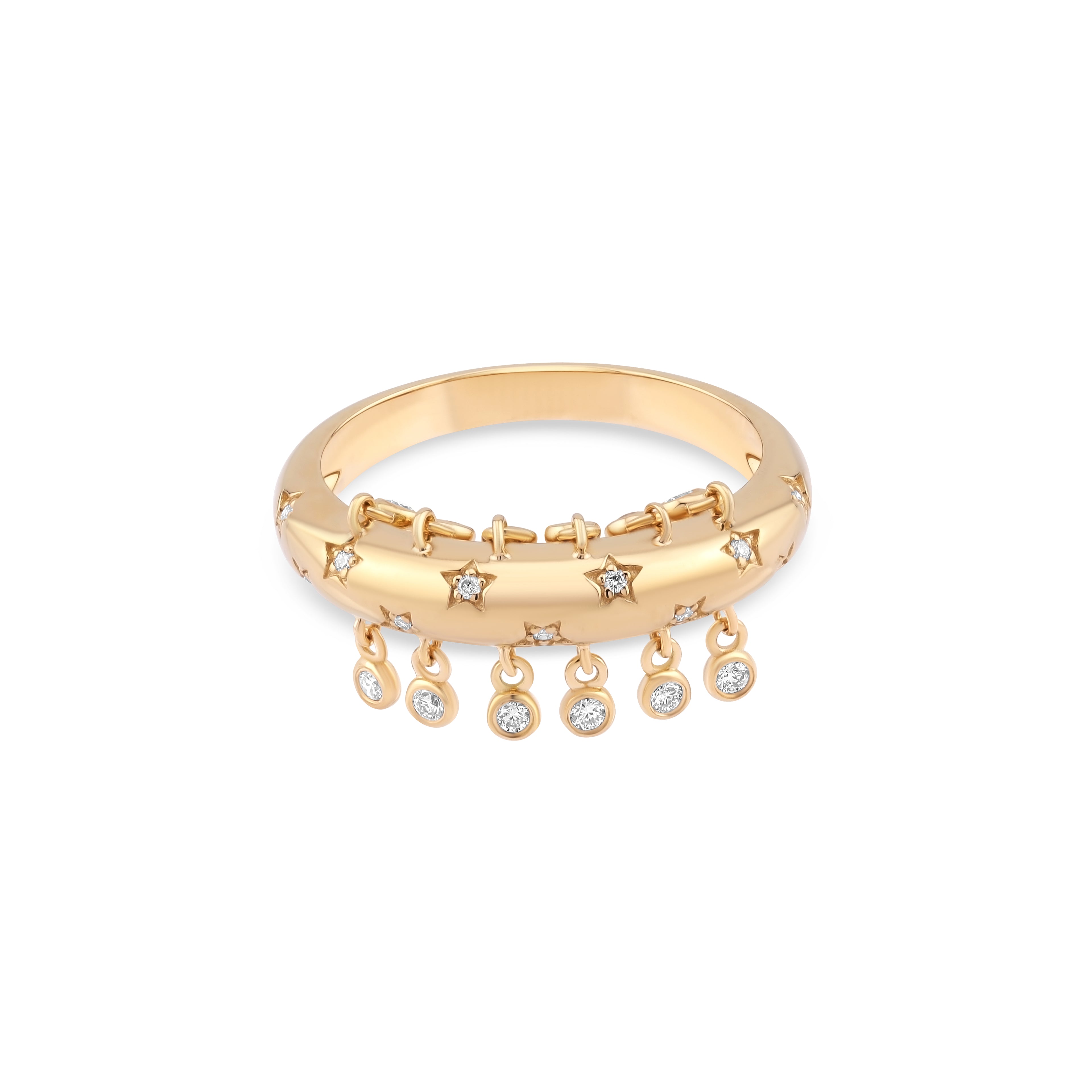 CRAFTED IN YELLOW GOLD AND SET WITH SPARKLING DIAMONDS, THIS THINNER BAND KEEPS THE BOLD DANGLING DIAMOND DROPS BUT WITH A LIGHTER, MORE REFINED FEEL.